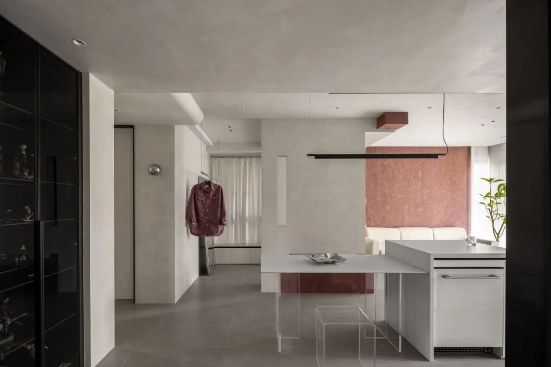 入户门对面设计一面镂空墙体, 墙面开长条形透视格, 视觉上有种“悬浮”效果。