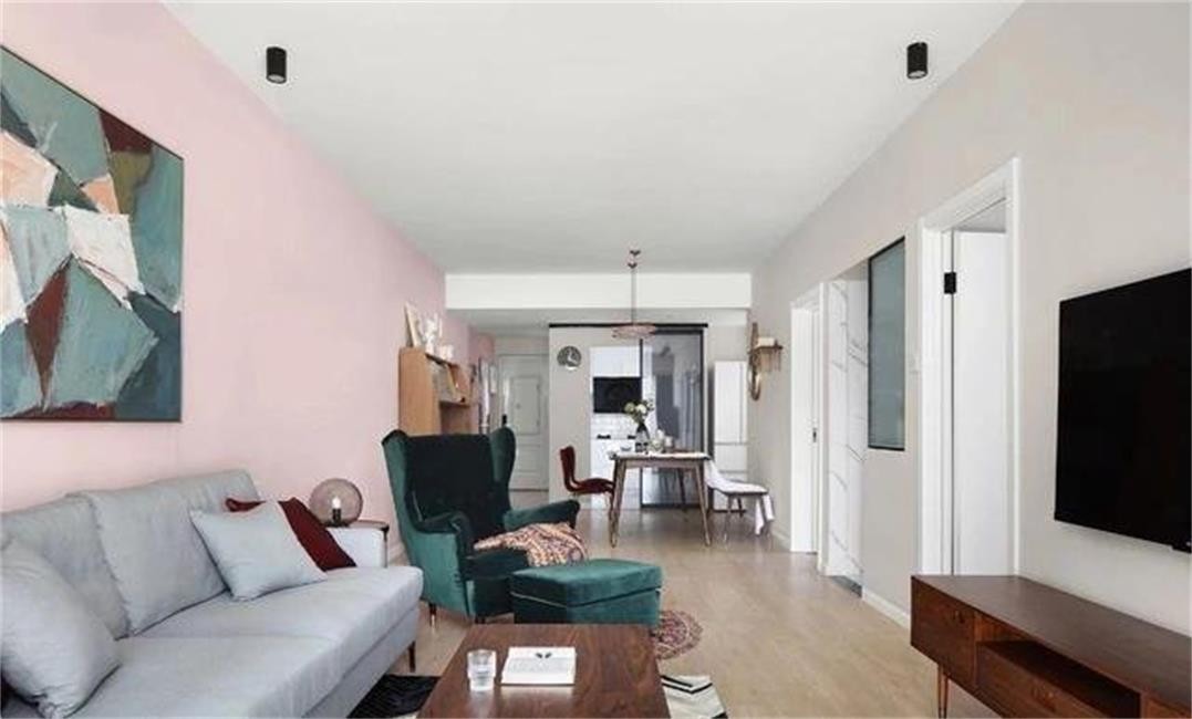 从餐厅区域望向客厅空间,可以拥有一览无余的视觉感,并且去吊顶和主灯式的设计,也让客厅少了小户型公寓的压抑感。