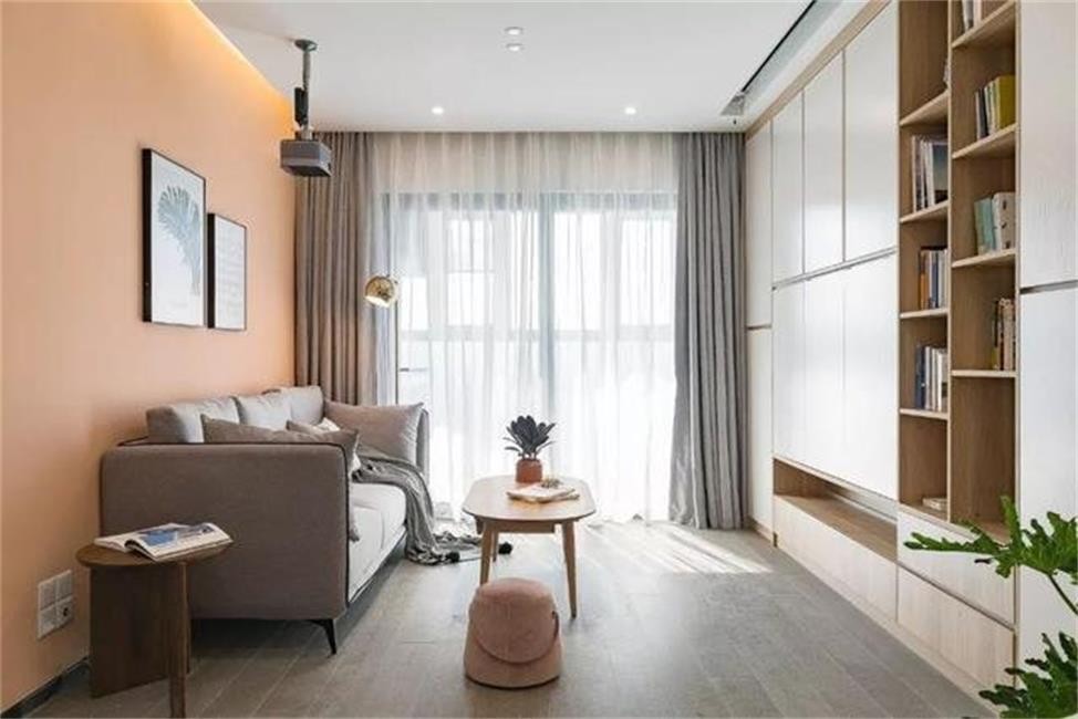 客厅以无主灯式设计为主,同时考虑到观影和读书需求,取消了电视墙,转而打造成一个储物墙。 投影仪和天花板上的可升降式荧幕,代替了电视,让整个客厅既有充盈的收纳区域,也能享受大屏幕观影。