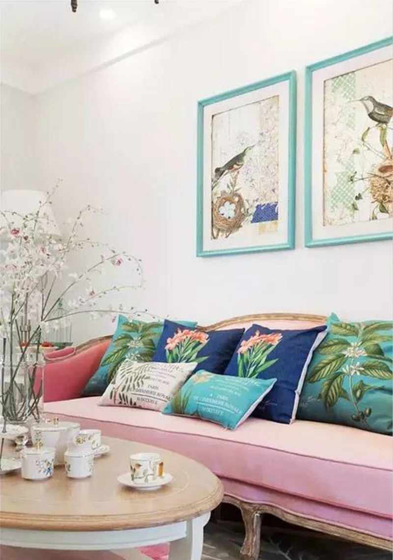 客厅的色彩运用的很丰富很缤纷,有粉红、青绿、橘黄等各种颜色,整体来看还是挺优雅迷人的,同时也看的出来家里的装修搭配应该是女主人说了算的