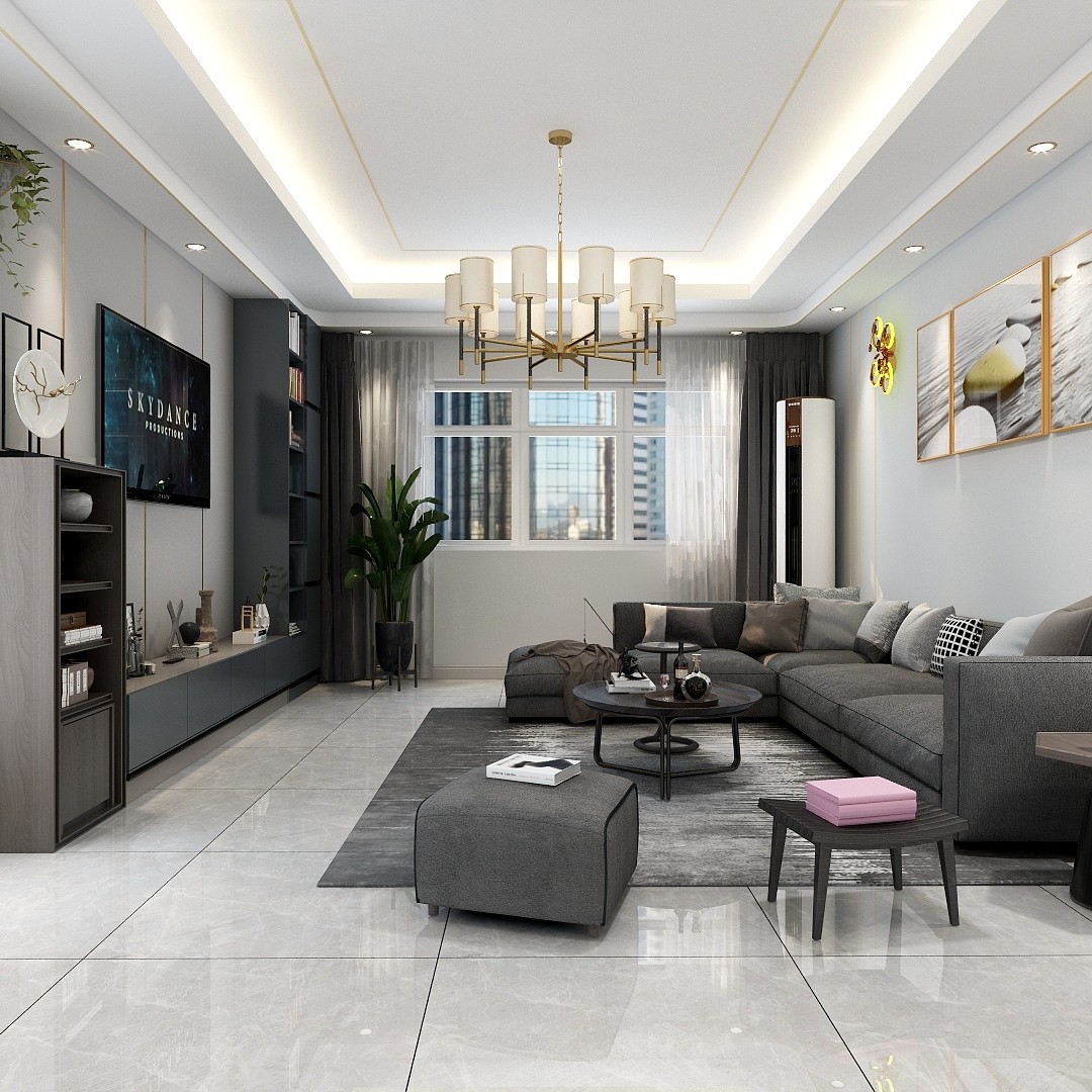 客厅以灰色为主色调,灰色沙发、灰色地毯以及黑色边框的咖啡桌共同构成了沉稳的基调。