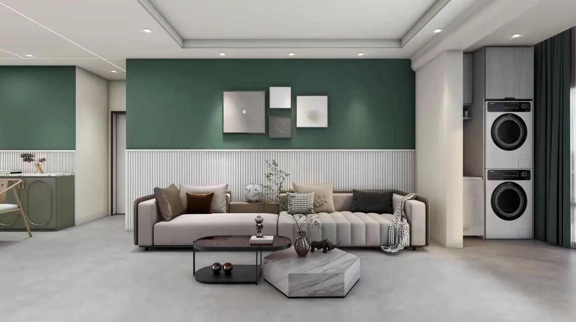 客厅,深色地板和水泥墙,突出了工业风的元素。