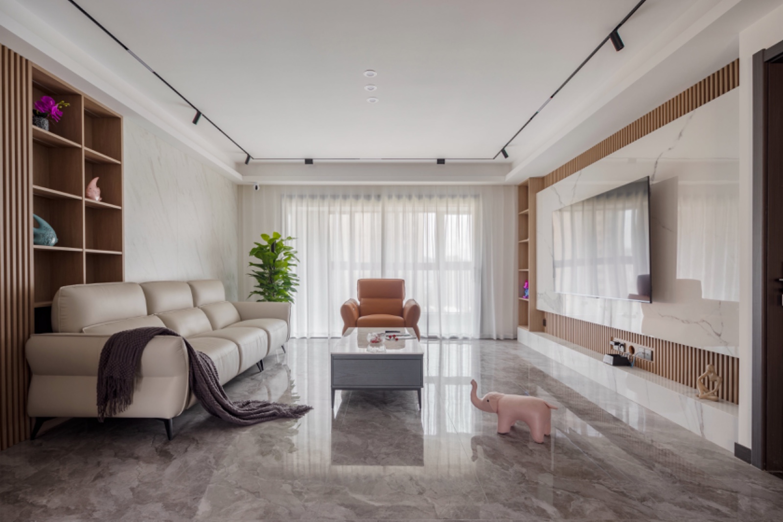 电视背景木格栅硬包背景做底,大理石背景装饰主背景面,单边定制的开放式观赏柜与作为木格栅背景的延伸,增加了层次感,大理石纹地台设计与背景相呼应。