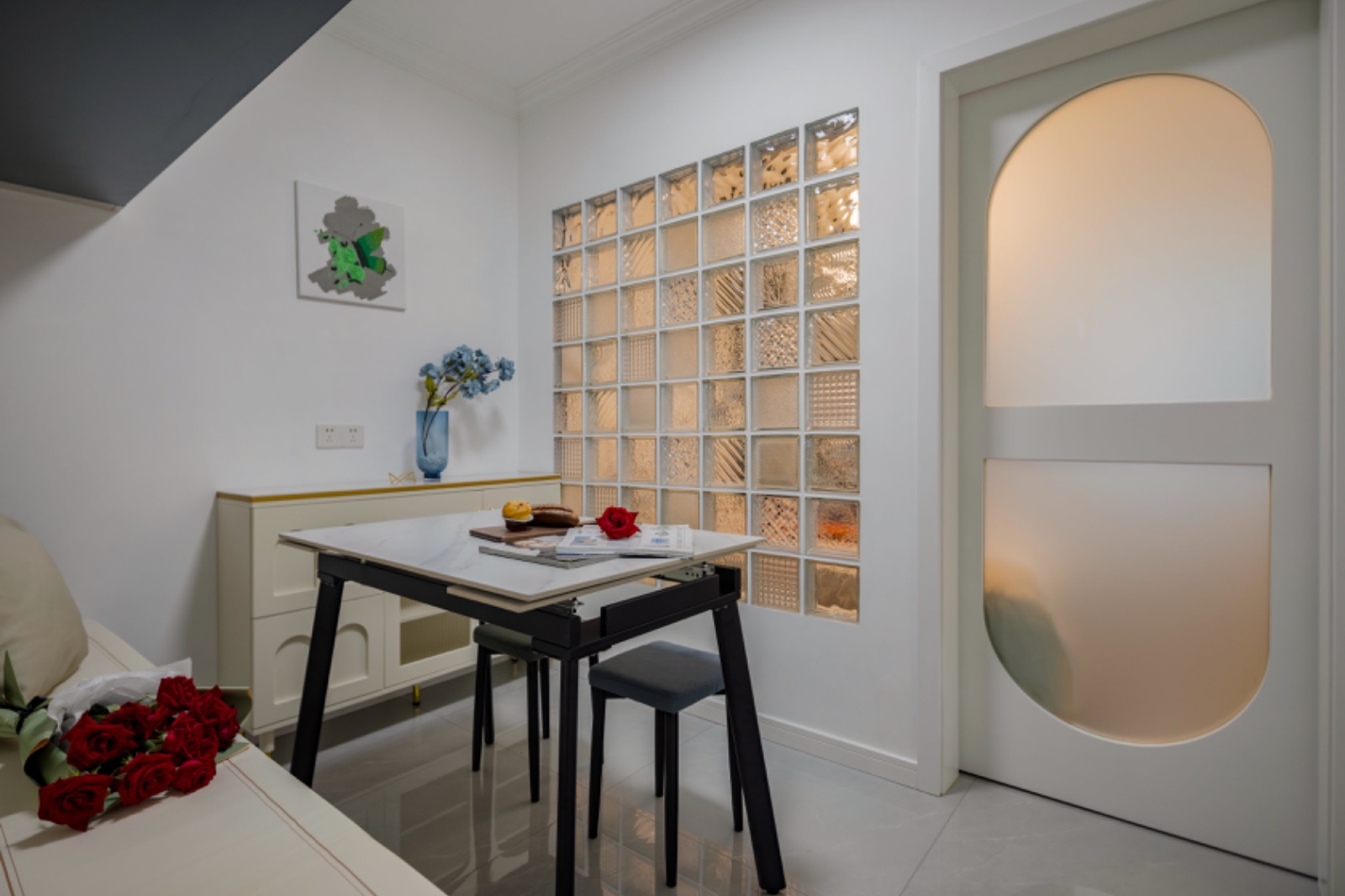 玻璃砖是本案的亮点,既保证了私密性,又为餐厅引入自然光,提升动区观赏性。老破小采光差,改造后的餐厅小而精致,实用美观两不误。