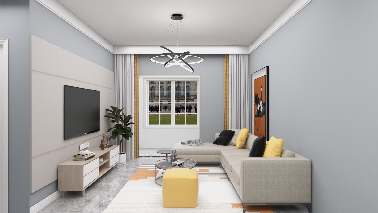 橙色和黑色作为点缀色,增添了空间的层次感和现代感。家具设计以简约为主,线条流畅,色彩搭配和谐,既实用又美观。