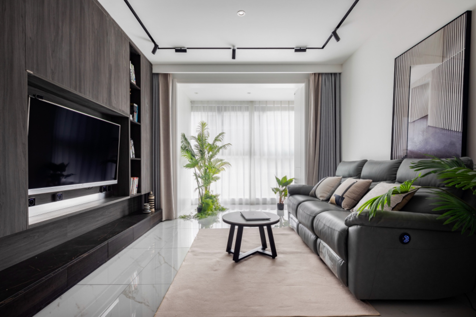 客厅同样是黑白色调的搭配,顶面、墙面、地面以白色为基调,整面电视柜墙选择酷雅黑灰,简约***。