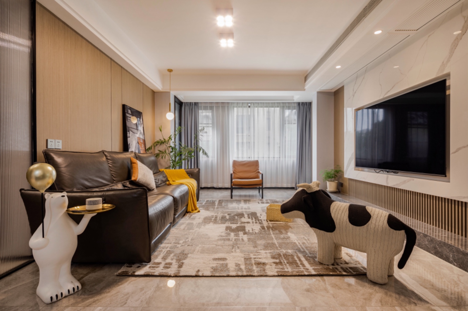 虽然是有娃家庭,屋主还是坚持选择真皮沙发,散发着慵懒洒脱气质,深棕色真皮沙发质感上乘,背景墙选择颜色较浅的木饰面,层次丰富,气场和谐。