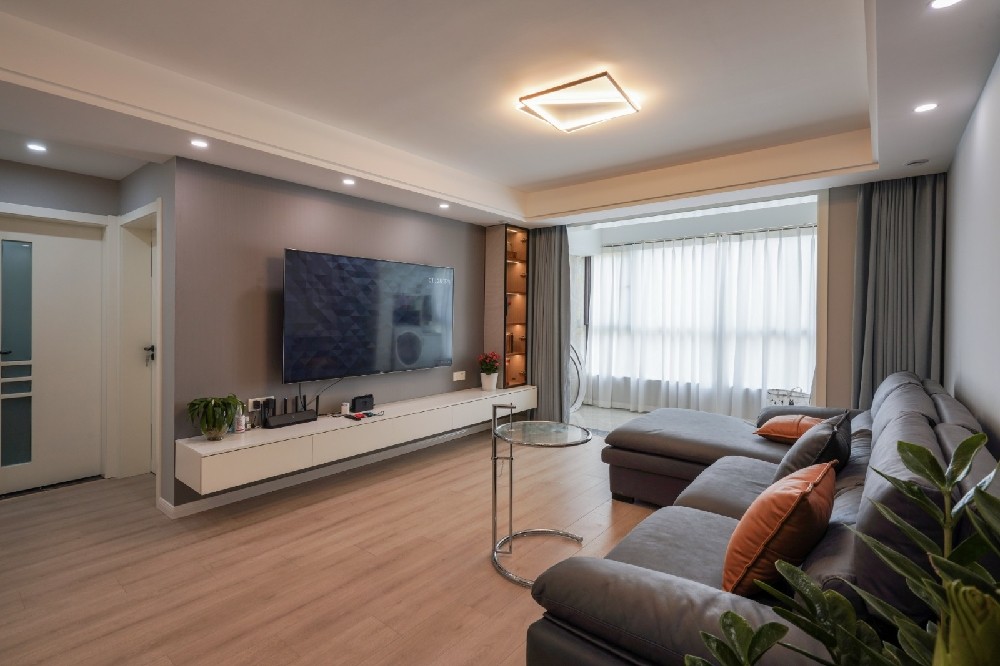 客厅电视背景以简单装饰壁柜加咖啡色墙漆为主,增加墙面的质感