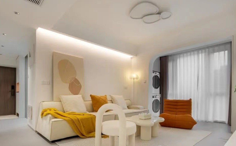 客厅以白色为主调,搭配橙色和黄色的沙发、抱枕等家具,营造出温馨舒适的氛围。