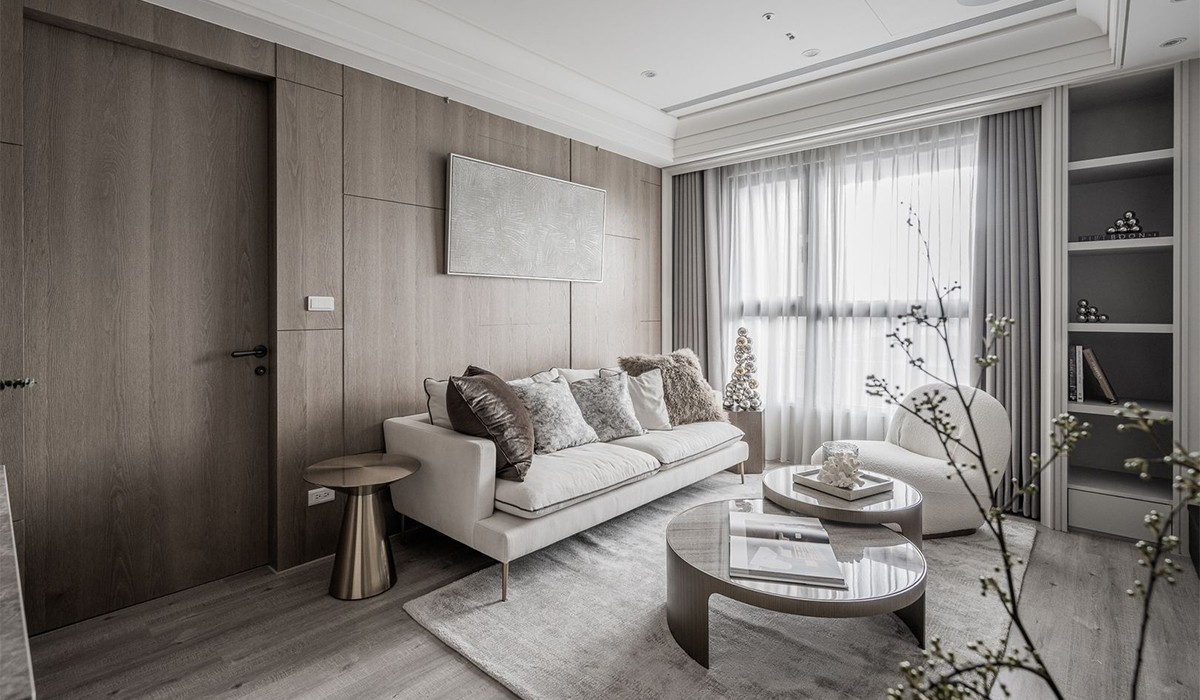 原始客餐厅格局并非如此方正,设计师解释,“因为建商把沙发背墙设定为收纳区,形成局部退缩的不平整墙面,这也造成客厅面深较为不足,还把沙发规划在通往主次卧室的通道之间,空间被过道分割得零碎,使坪效运用被大幅限制住”