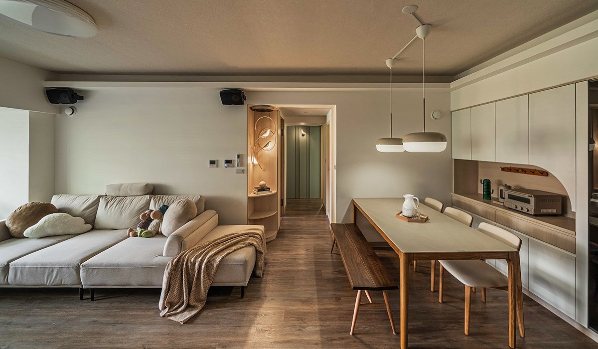 将原封闭式厨房拆除为半开放式样态,拓宽了门洞,使宽幅约达 200 公分,透过木工定制圆弧收边,巧妙修饰了过于方正的门框,并刻意铺叙高彩度六角砖,衬作厨房一侧,让坐在沙发时的视线轻盈入内,感知漾起了惬意氛围。