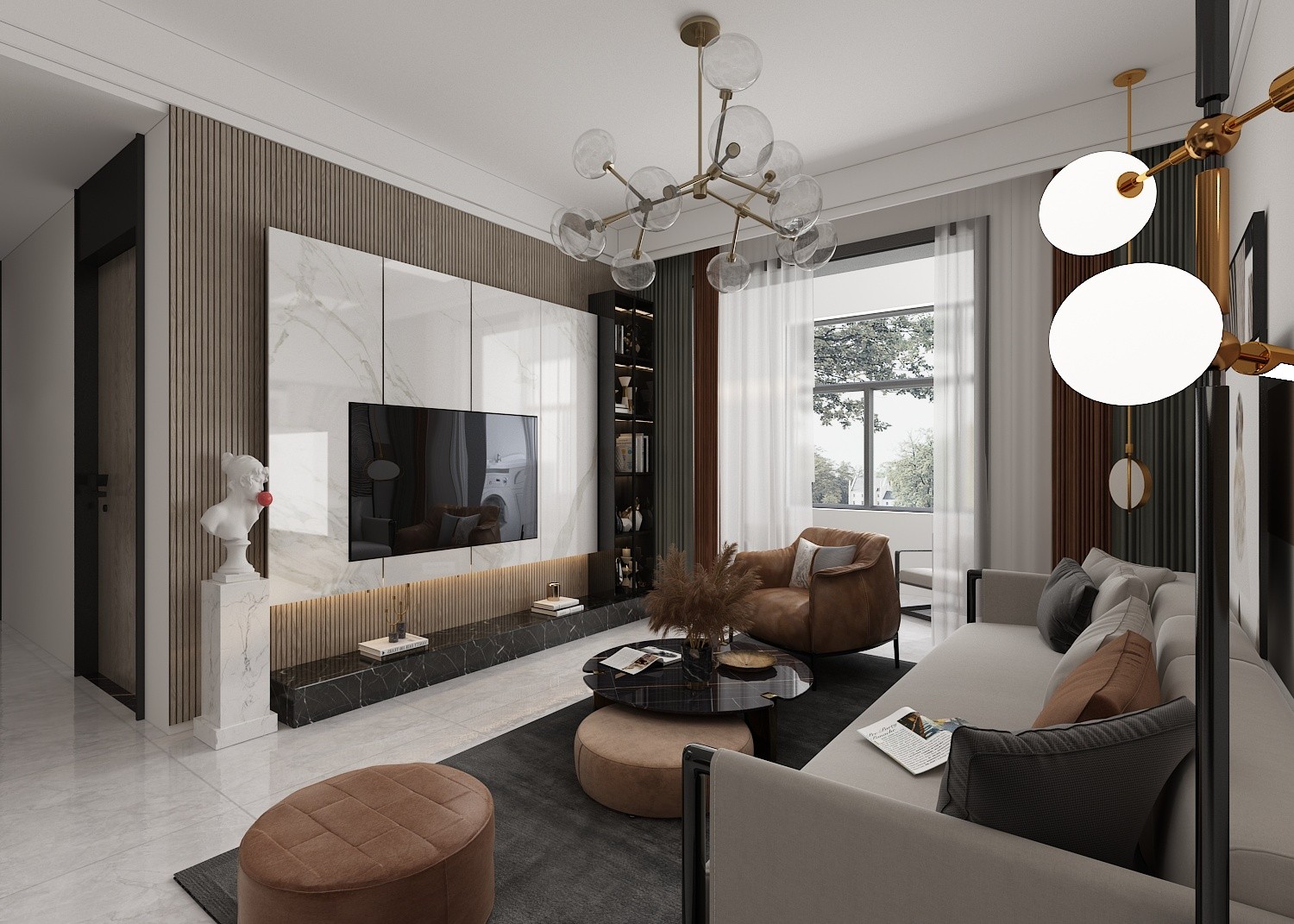 客厅的现代轻奢风格展现了独特的精致感与实用性。整个空间以白色和灰色为基调