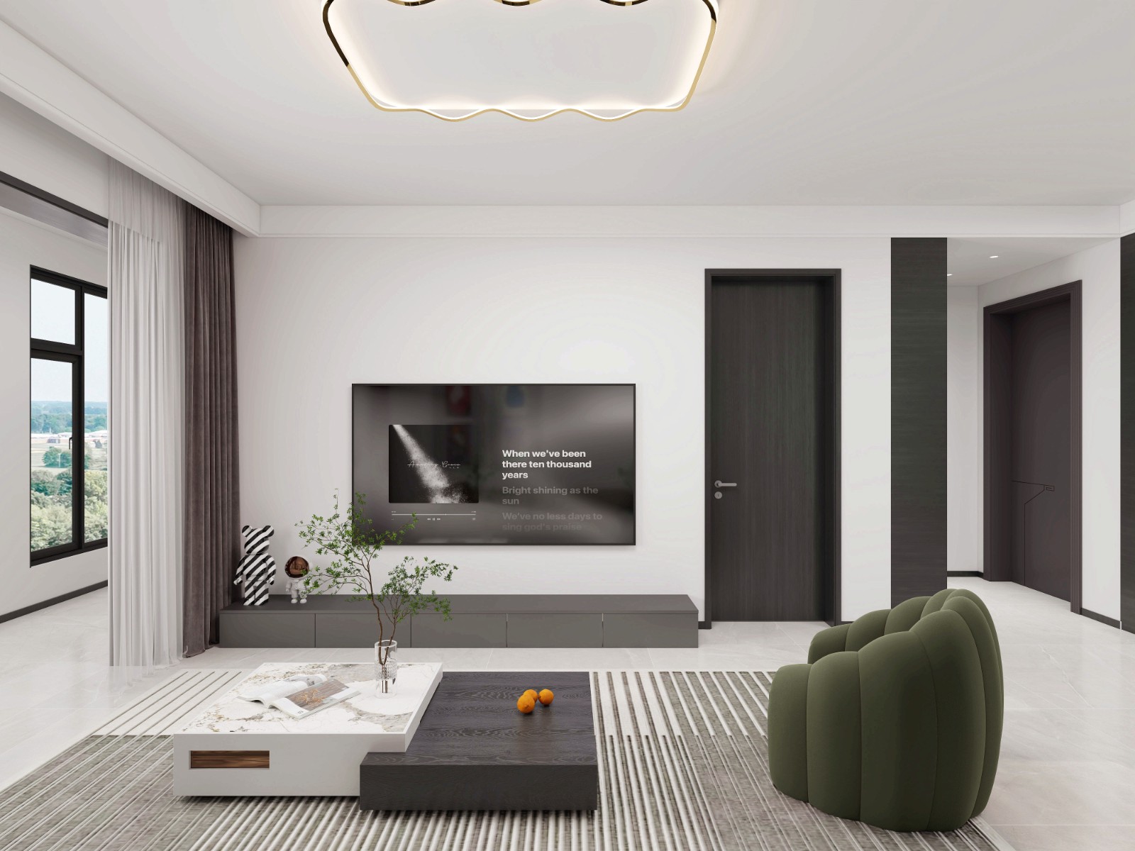 客厅采用了现代简约的设计风格,以白色和米白色为主色调,搭配黑色和绿色的点缀,营造出一种简洁而不失活力的氛围。浅色的大理石瓷砖地板和白色的墙面进一步强化了这种明亮、清爽的感觉。