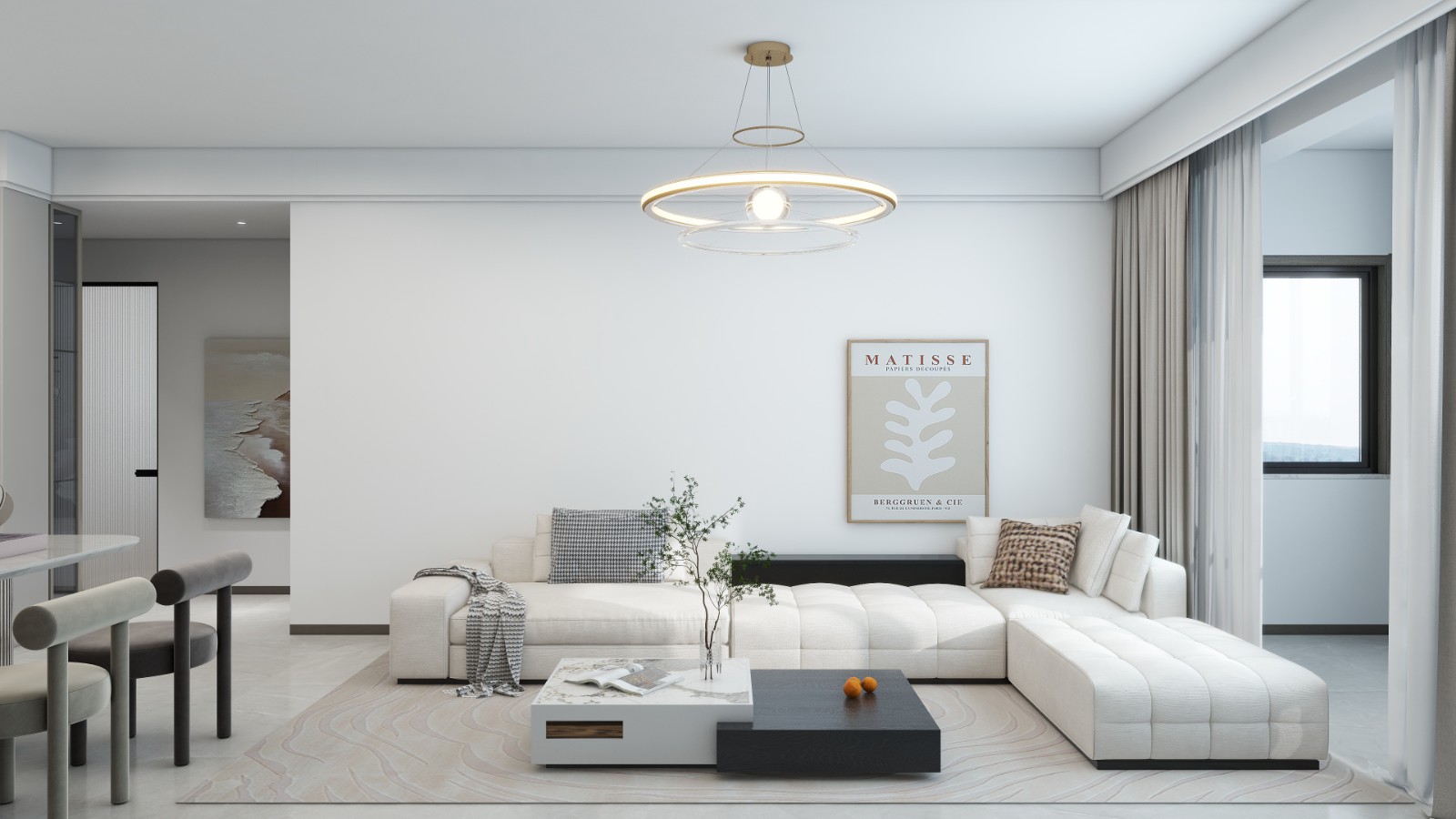 在白色基调上,搭配了灰色地毯、黑色茶几以及橙色的小物件作为点缀色,这些色彩的运用既丰富了空间的层次感,又增添了活力和温暖感。