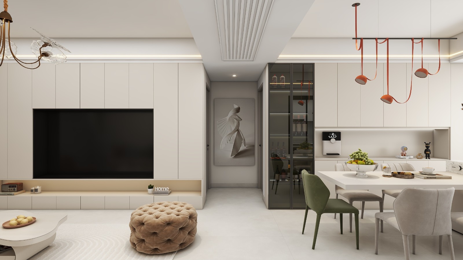 客厅所有墙面采用可可蛋奶的颜色,使空间整体柔和舒适