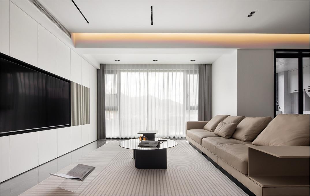 电视背景墙为嵌入式不锈钢电视壁龛,满焊一体式工艺,无焊点无拼缝,收纳有序的同时使空间更加宽敞。