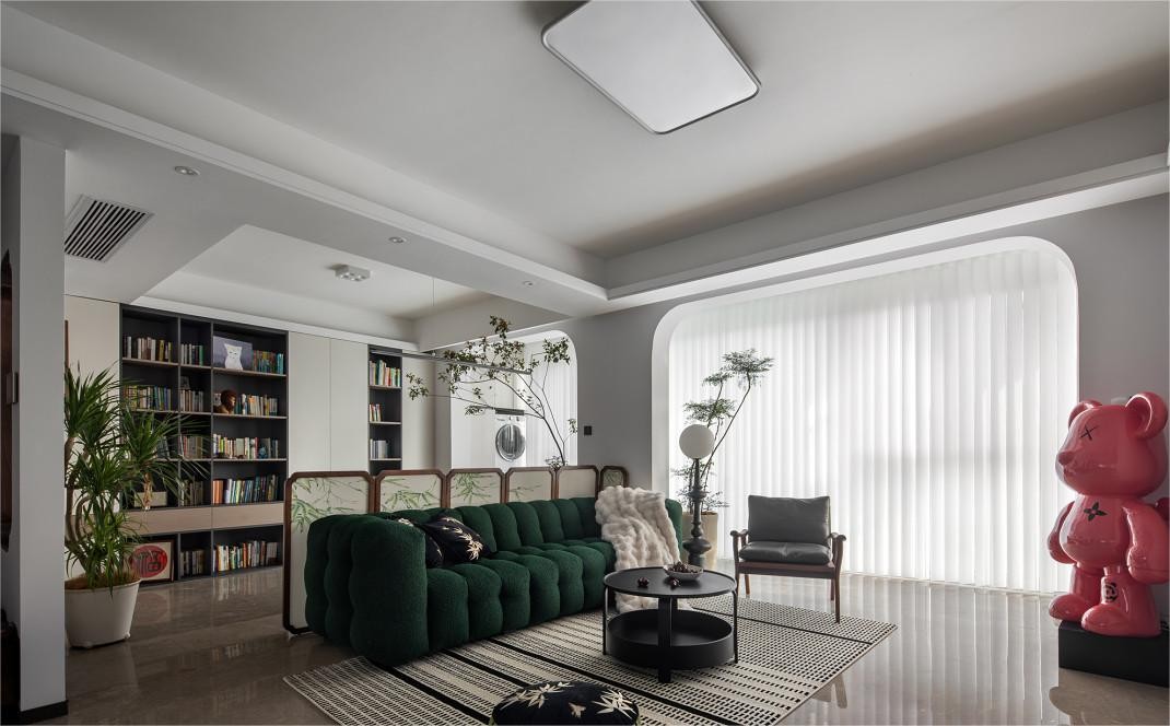客厅与阳台打通,拱形门做隔断,增加采光的同时搭配整体上以绿色和米色为主的配色,从视觉上增加舒适度。