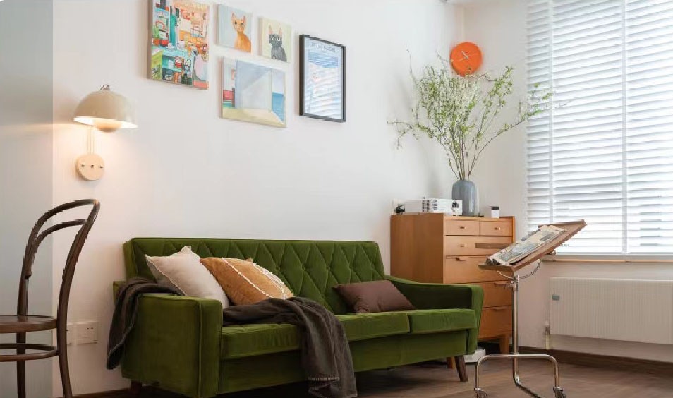 客厅用投影取代电视,在沙发对面吊顶里藏了幕布,沙发边专门定制了一个中古款矮柜,增加储物的同时顶上专门用来放投影等设备。