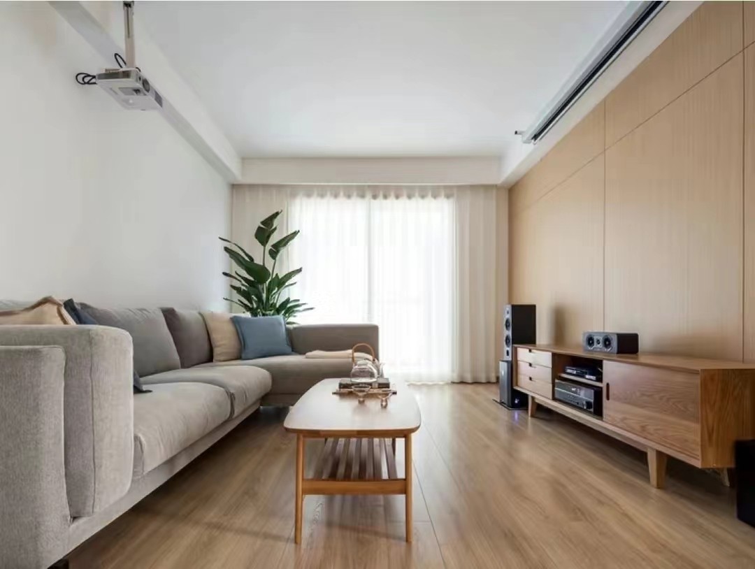 投影仪幕布选择了100寸的大小,视距3.5米左右,不会觉得距离太近,关上主卧房门,也能刚好适应投影仪幕布的放置,周末的晚上和家人窝在沙发上看一场电影,生活如此美好。