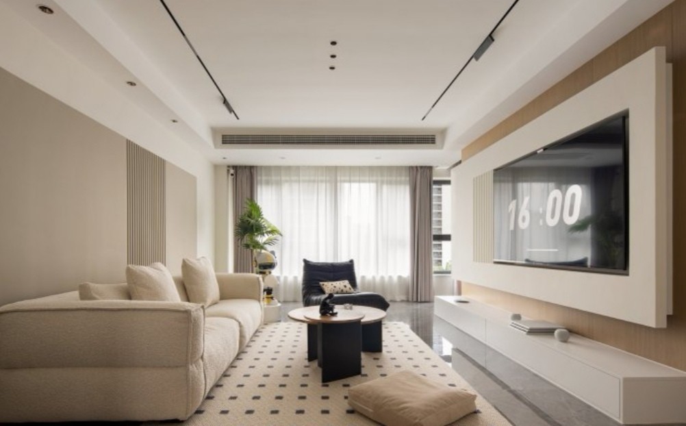 客厅区域的设计遵循统一的简约格调,造型简洁但不失设计感,沙发背景以石膏板做造型,搭配弧形元素、拉槽设计与奶咖色调,层次丰富而不杂乱。