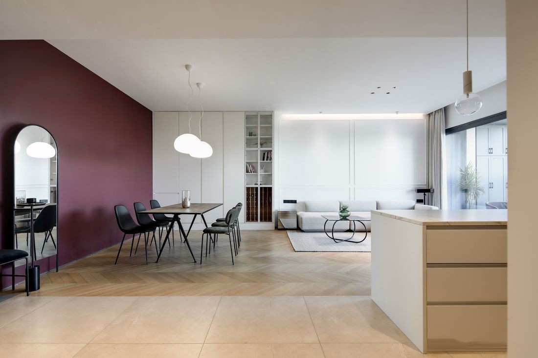 打通墙体后,厨房和客餐厅多了连接,更显通透。大件家电则选择“隐身”,空间姿态更轻薄简约、收纳力足够,同时延续着玛萨拉酒红和风暴绿的撞色气质。