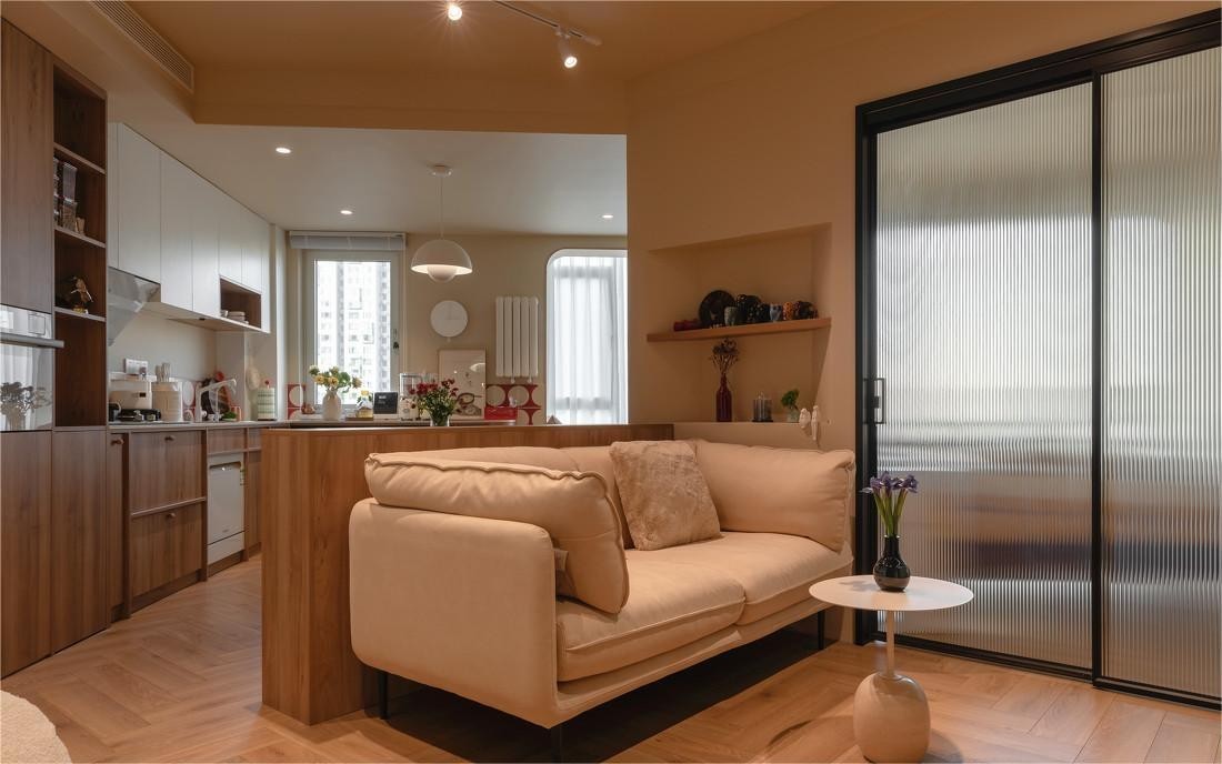 为了打造开阔自由的公区,客餐厨空间开放互通,保证公区宽绰明亮。虽然是一人独居,但依然选择了软乎乎的双人位沙发作为客厅的视觉焦点,为忙碌的居者提供一个可以放松“葛优躺”的地方。