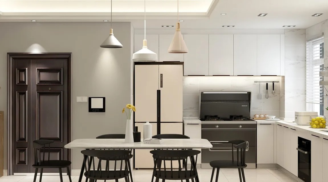 厨房与餐厅被巧妙地设计在同一开放空间内,这种开放式布局增强了空间的通透感,使得烹饪与用餐区域之间的互动更加便捷。 主体色彩以白色和灰色为主,白色冰箱、橱柜与灰色墙壁形成鲜明对比,营造出干净、清爽的视觉效果。