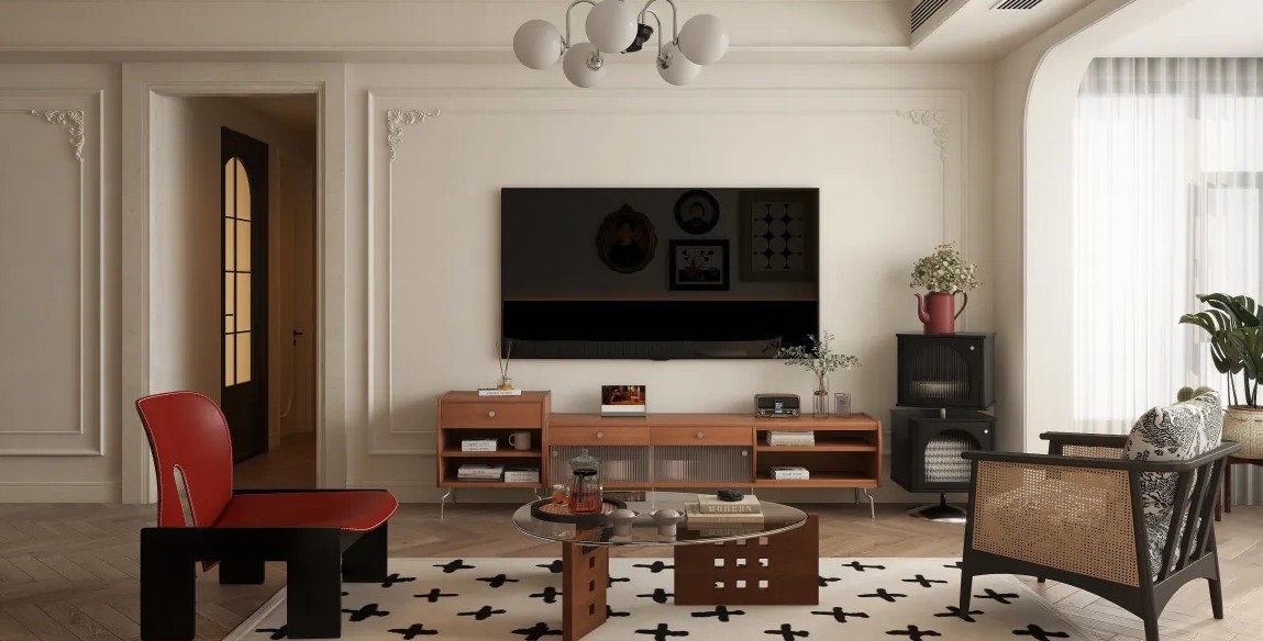 客厅展现出现代风格的特点,强调简洁、明快的线条和色彩搭配,营造出一种时尚、舒适的居住环境。 客厅以白色为主色调,黑色和红色作为点缀色,整体色彩搭配简洁而富有现代感。墙上挂着的装饰画和灯具也为空间增添了色彩和光影效果。