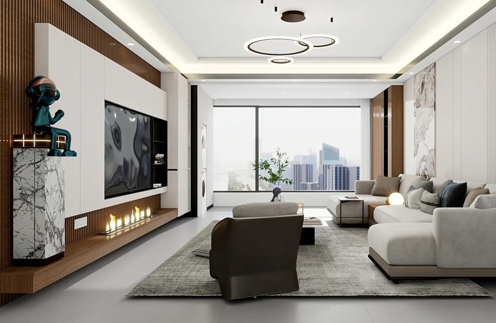 茶几上摆放的圆形装饰品和书籍,既展示了主人的品味,又提供了娱乐和学习的功能。 大型白色设计,简洁大方,与客厅的整体风格相协调。大屏幕平板电视,提供了高清的观影体验,适合家庭娱乐和放松。