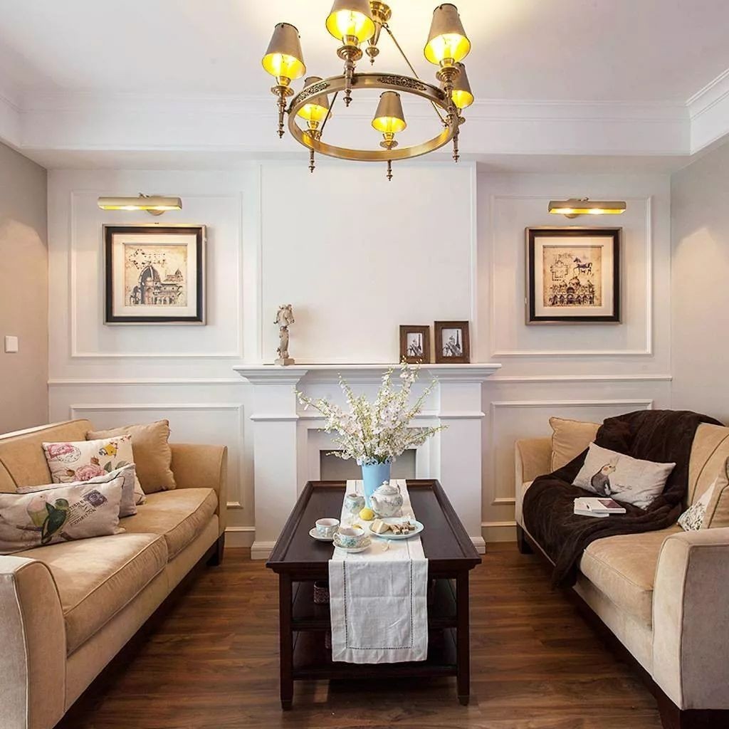 在餐厅边上的客厅空间,没有把沙发对着电视摆放,而是在客厅的两侧摆放了两张双人沙发,中间做了壁炉造型,这样的设计很有美式范的感觉。