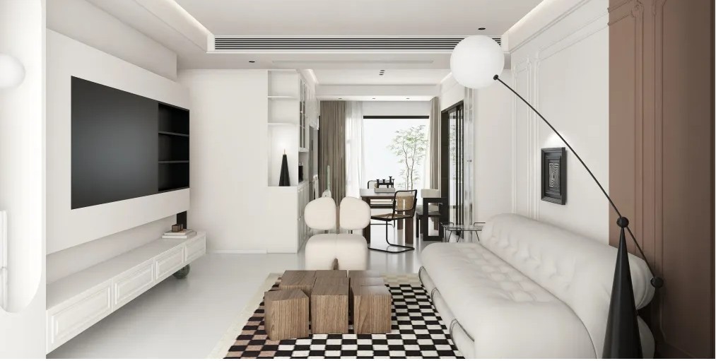 该室内设计采用了现代简约风格,以白色和棕色 为主色调,黑色元素作为点缀,营造出一种简 洁、明亮且不失高雅的氛围