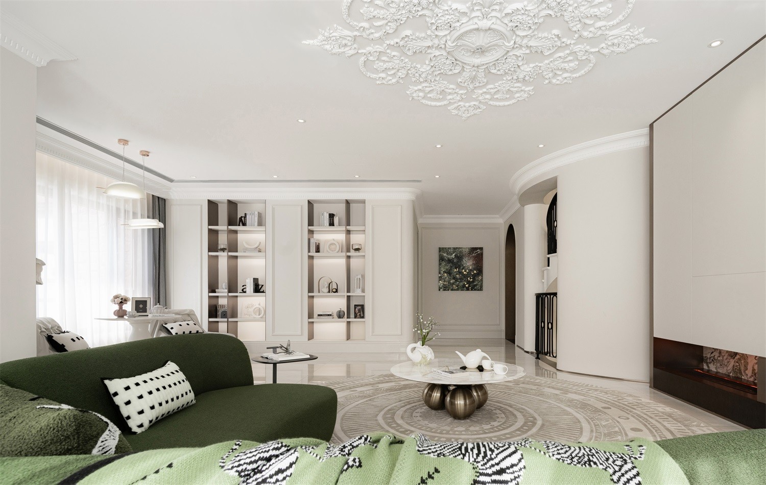 墙面内嵌壁炉、黑色曲线栏杆,和聚焦于天花的定制莨苕叶石膏造型天花,让整体空间既保留古典法式经久耐看的标志性元素,又融入极简现代的时尚趋势。