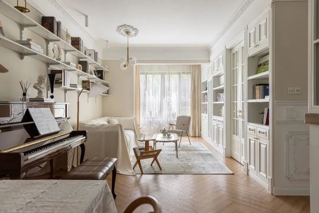 本案是我们美女业主属于自己的公寓,她是一位大学英语老师,喜欢写作,也喜欢阅读经典英文原著,所以给客户设计了大存储量的藏书空间,为了满足法式风高挑的空间感,保留了原始建筑层高,她喜欢的家居风格是带点乡村风的休闲法式风格,空间整体以奶杏色和白色为主,复古法式线条勾勒出精致优雅的调性,整体搭配柚木与胡桃木藤编质感的家具,古朴自然,局部点缀深浅不一的绿色,更显清新自在,她热爱生活,热爱工作