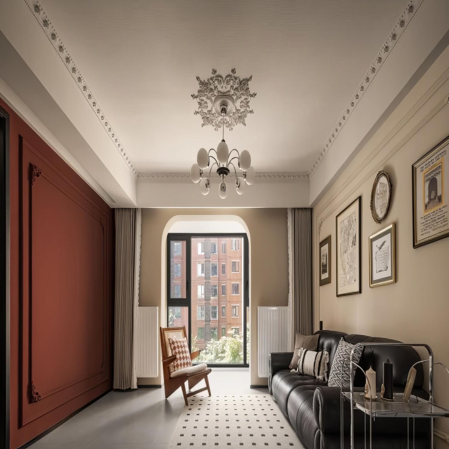 整个电视墙刷了一层砖红色芬琳漆,加上石膏线,没有做电视柜,也没有装电视,屋主说现在基本上和电视绝缘了,除了逢年过节回父母家会看看电视,平时基本不挨边,所以就直接淘汰电视,换成了投影,提前做预埋件,平时收起来可以达到完全隐形的状态,没有整面的电视柜,家里也会显得清爽很多。