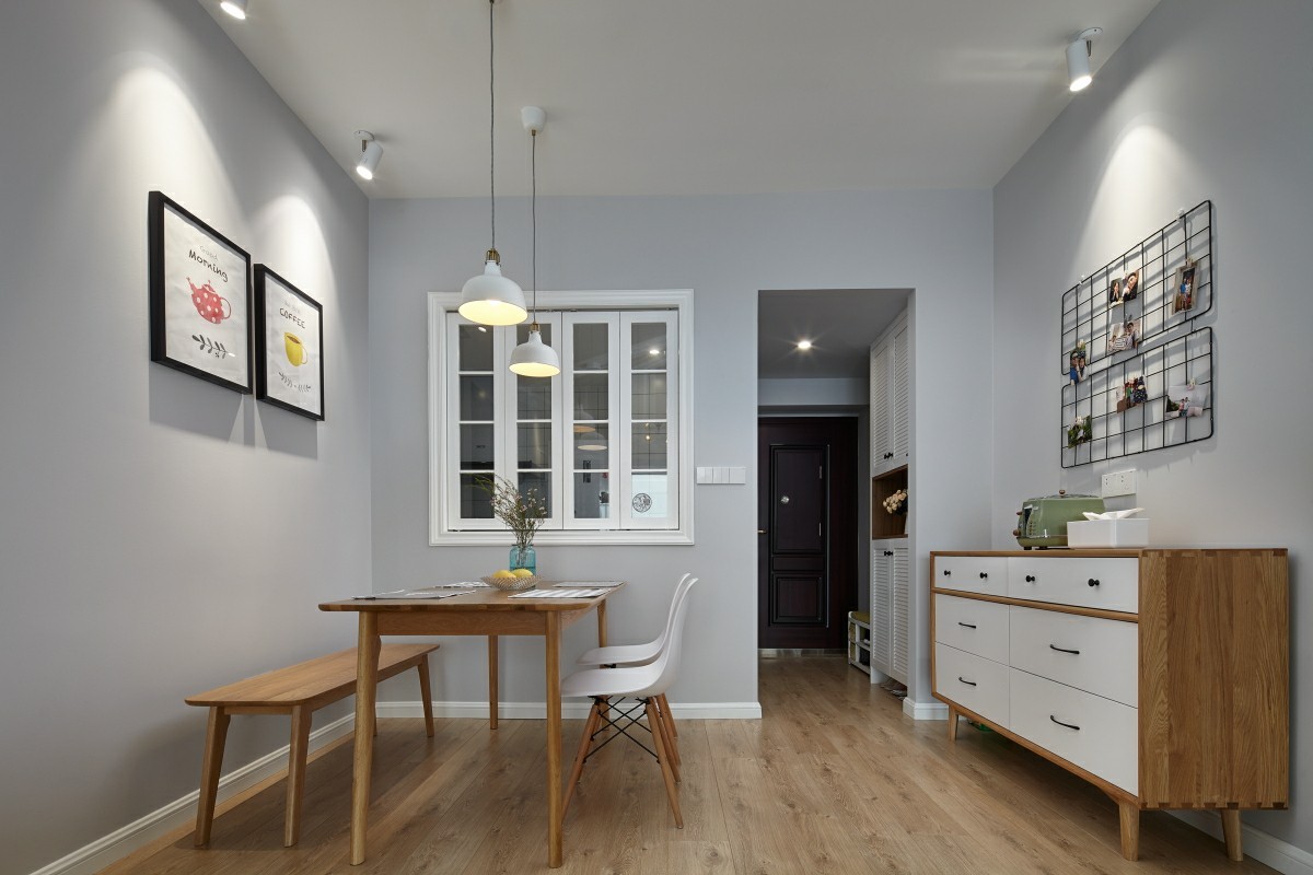 餐厅的设计装修也是非常的贴近大自然,通铺木色地板,餐桌是木色白色搭配,墙面搭配着几幅装饰画,丰富了空间美感