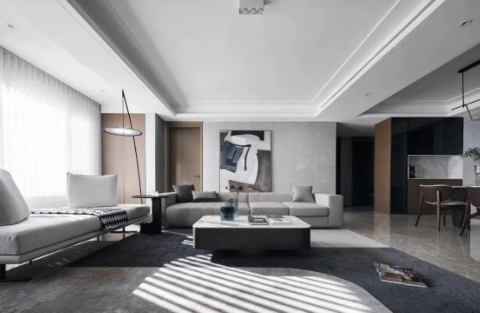 客厅,利用简单的灰色作为主色调,木色穿插于空间,平面吊顶简约大方,搭配无主灯设计,营造出时尚优雅而端庄的客厅空间氛围