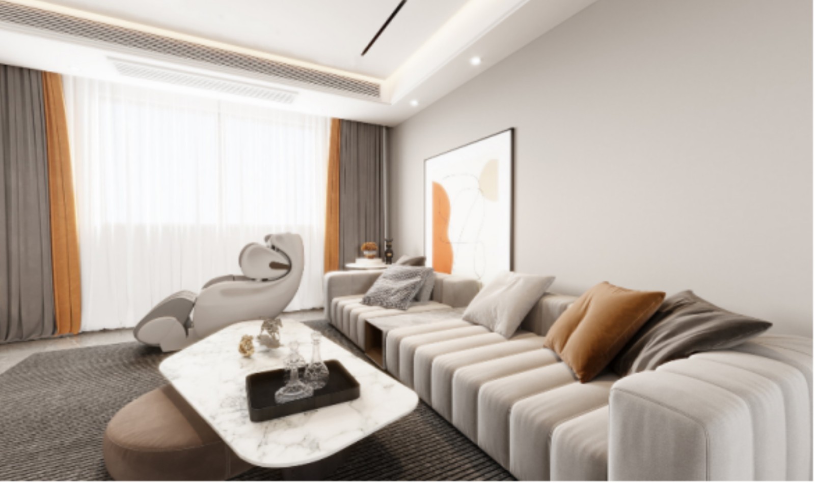 客厅采用整体无主灯设计,让极简风格更舒适,奶咖色系为主色调,提升了空间质感