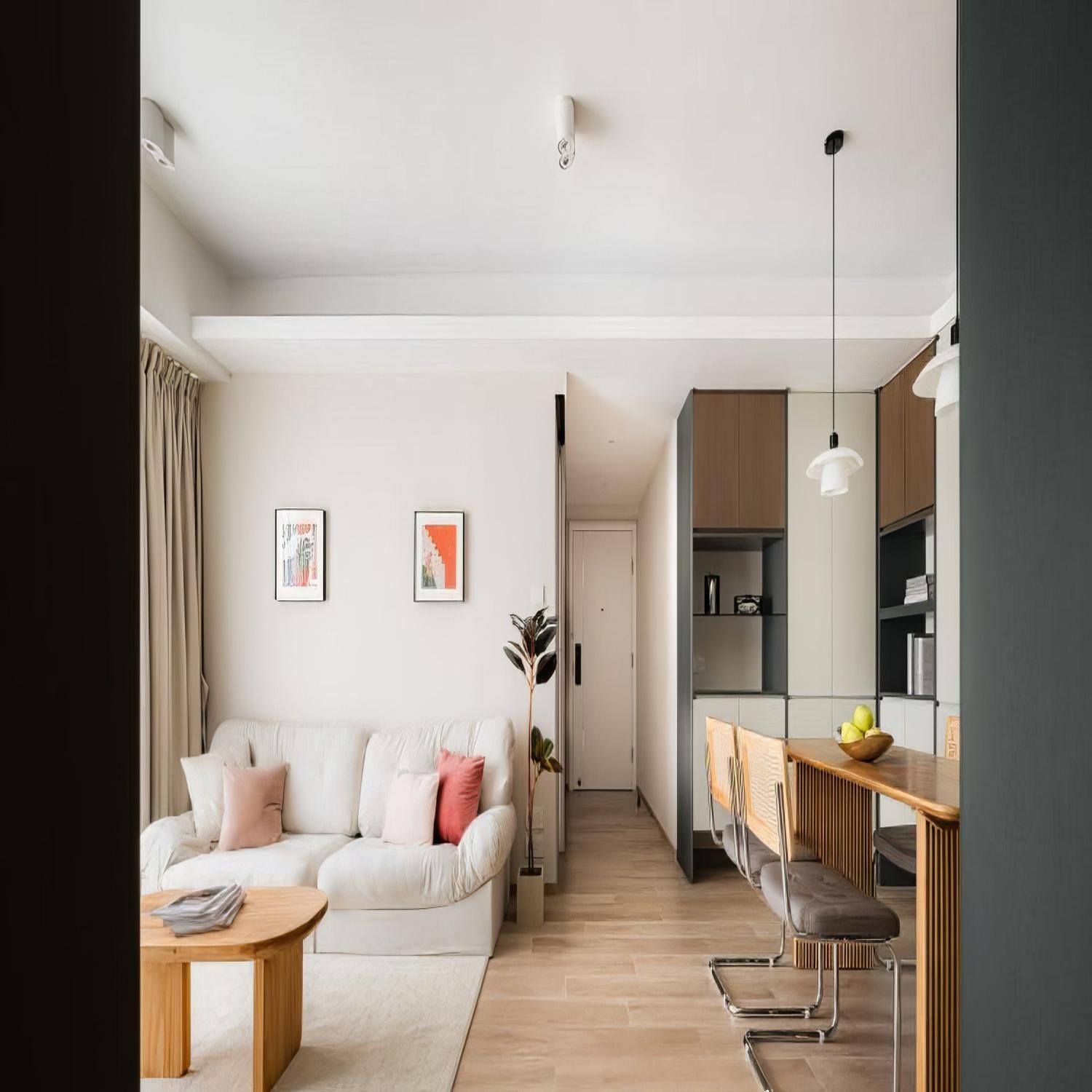 1.原始精装房结构没有做大量的修改,而是通过软装来调控空间使得居者有更舒适的居住体验。 2.客餐一条将客厅与餐厅完美融合,提高空间利用率,保留阳台拓宽自然生活的边界。 3.L型厨房布局扩大操作空间根据屋主使用习惯让整个厨房区域布局相对合理,使用起来更方便。封闭式厨房隔绝油烟。 4.将客厅餐厅厨房等承载家务和娱乐功能的区域规划在户型最外侧。卧室书房等安静私密的环境规划在内测,通过动区与静区的划分,让