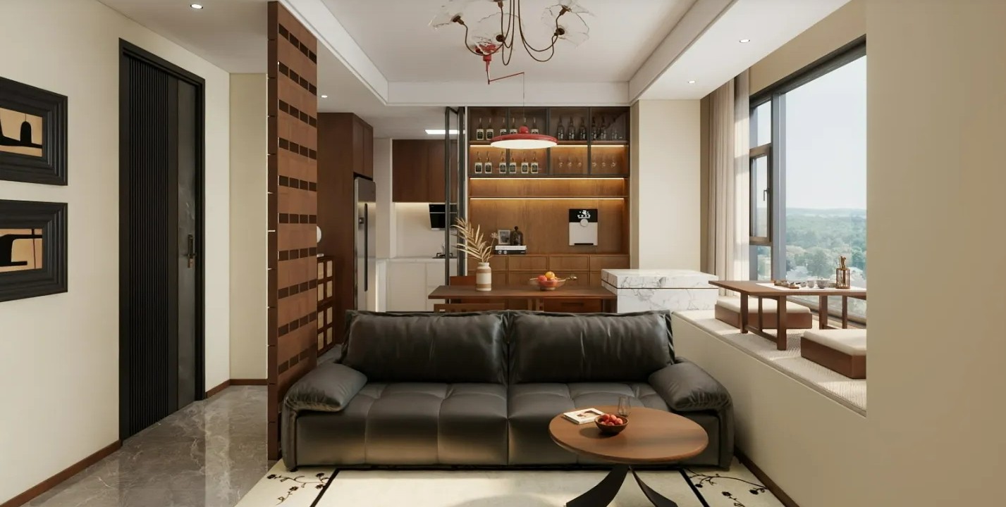 在视觉上给人以温暖和舒适感,而且在材质上也展现了对传统工艺的尊重与传承。纯黑色的皮质家具以其耐用性和易清洁的特点,为整个空间增添了一抹现代感,同时与复古木质柜体形成鲜明对比,营造出一种既怀旧又时尚的氛围。