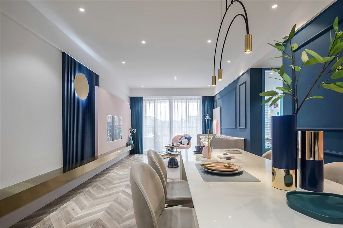 客厅空间以简朴的灰色,沉稳的蓝色,可爱的粉色为主,大面积运用蓝色为基调,再通过线条的处理方式,增加空间的层次感,局部金色线条的点缀,与沙发和抱枕的跳色互为呼应,使得空间的包容性更强,在装饰画和窗帘的选择上也是精心挑选的,与整体空间的轻奢形成互动,整体感觉充满时尚与温馨