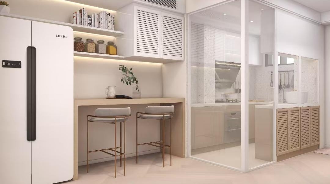 厨房设计在了进门的右侧,整体以白色和原木色为主,通透明亮。
