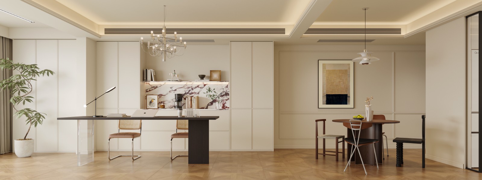 房间硬装简洁,加入适当的石膏线条增加层次,主要靠软装的一个搭配呈现效果