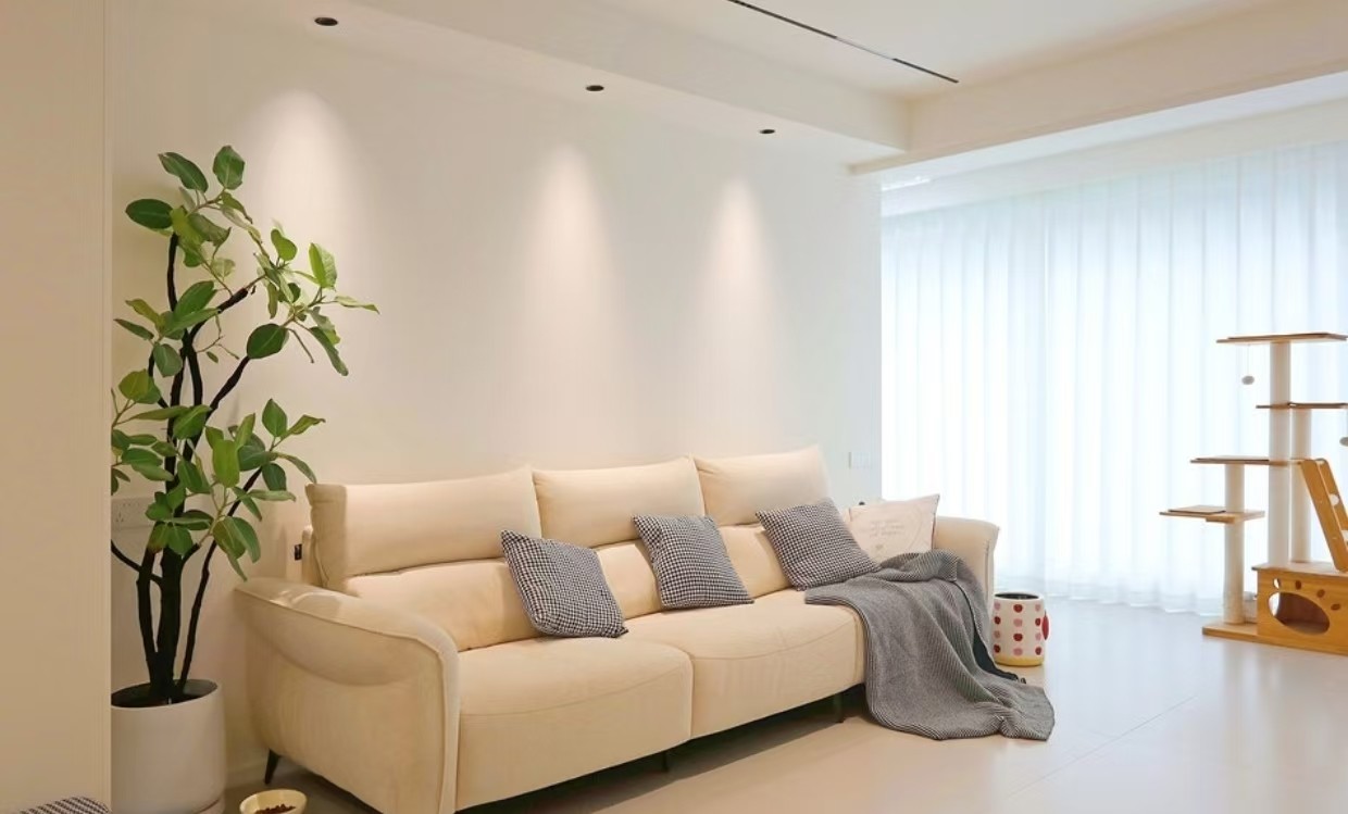 此客厅以浅色为主色调,营造出温馨氛围。沙发搭配简约,电视墙整洁,业主对宠物的喜爱对此设有猫爬架,整体采光良好