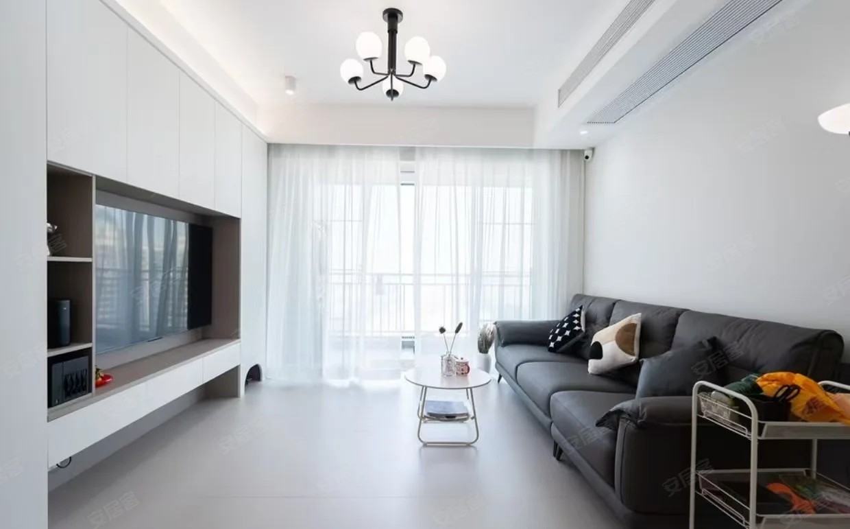 客厅设计简约现代。浅灰色沙发搭配几何图案抱枕,时尚且舒适。电视嵌入白色柜体,节省空间且美观。中央吊灯与侧墙壁灯提供充足照明。白色窗帘保证采光的同时增添了柔和感,小茶几和置物架则为空间增添了实用性