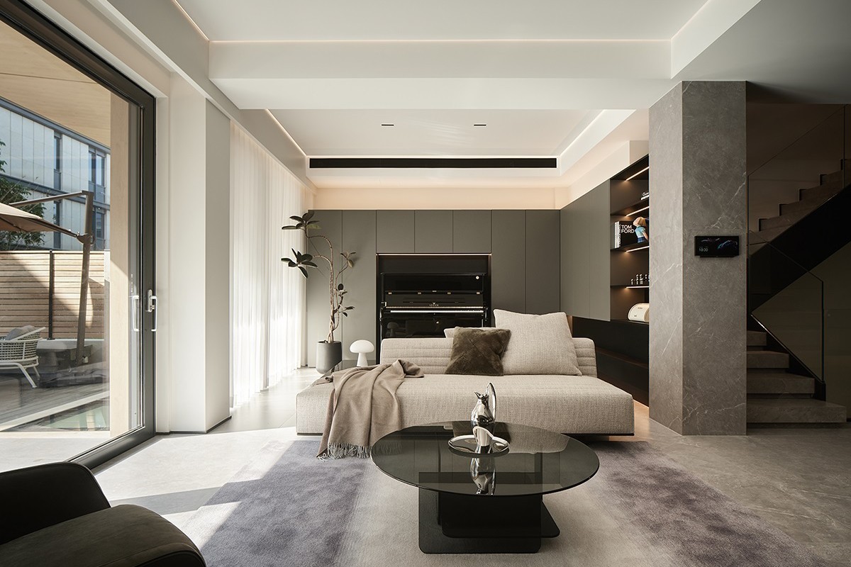 大面积的白色从视觉上再次增强了空间的宽敞感,并通过立面的深色饰面与地下室的会客厅有所呼应,