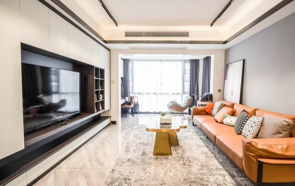 现代风格的客厅。客厅以橙色沙发为视觉中心,搭配几何图案抱枕,时尚且舒适。电视墙设计简约,旁边有储物格,兼具美观与实用。大面积的落地窗使空间明亮通透,室内光线充足。整体布局合理,体现了现代简约的设计理念