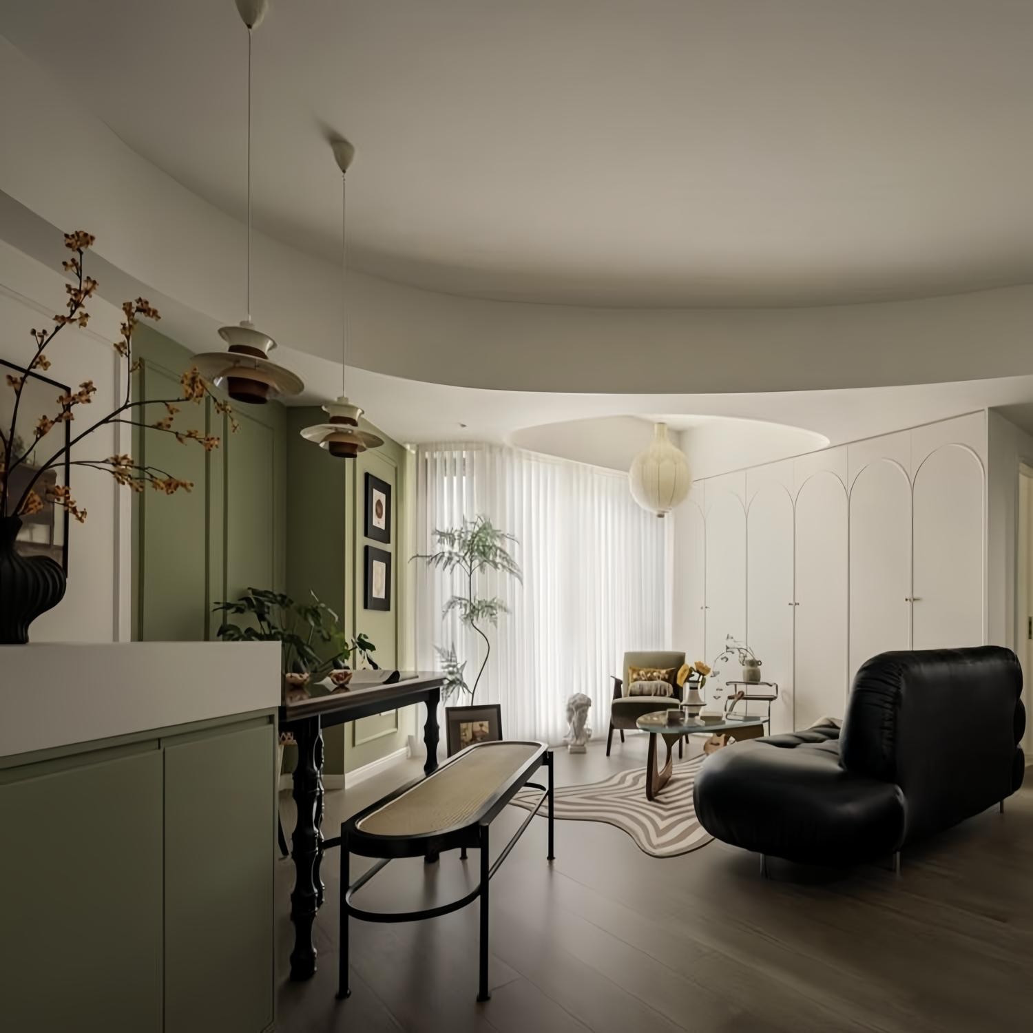 客厅部分是原来的生活阳台和餐厅部分,拆除了阳台那边的墙,打通了。为了弱化阳台那条Y形的梁,客餐厅区域的顶走了两个弧形吊顶,一大一小,小的弧形吊顶中间装一盏吊灯,反而让空间更有趣更有氛围了。