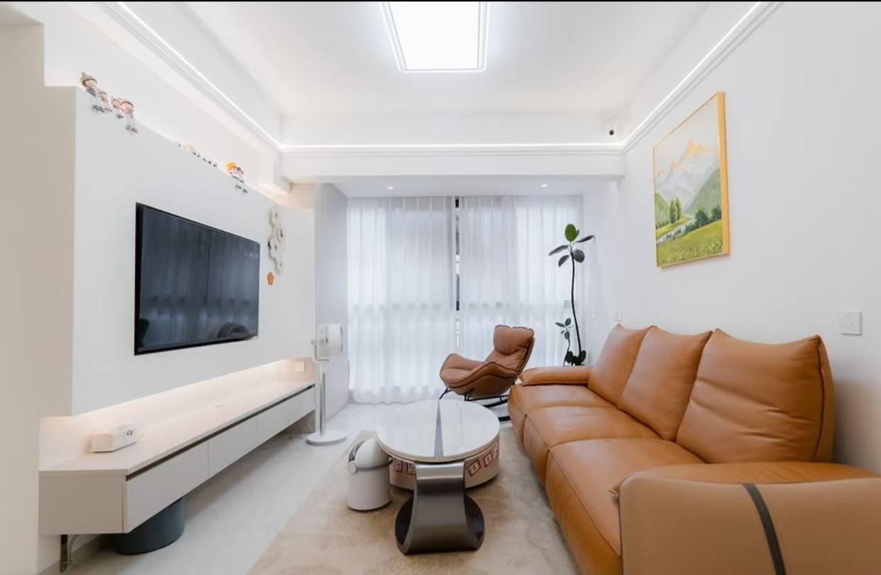 客厅以浅色系为主,搭配棕色沙发和浅色地毯,营造出温馨氛围。餐厅的简约餐桌椅与客厅风格统一。墙上的装饰画和绿植增添了生机。整体空间布局合理,采光良好,给人一种舒适且时尚的感觉