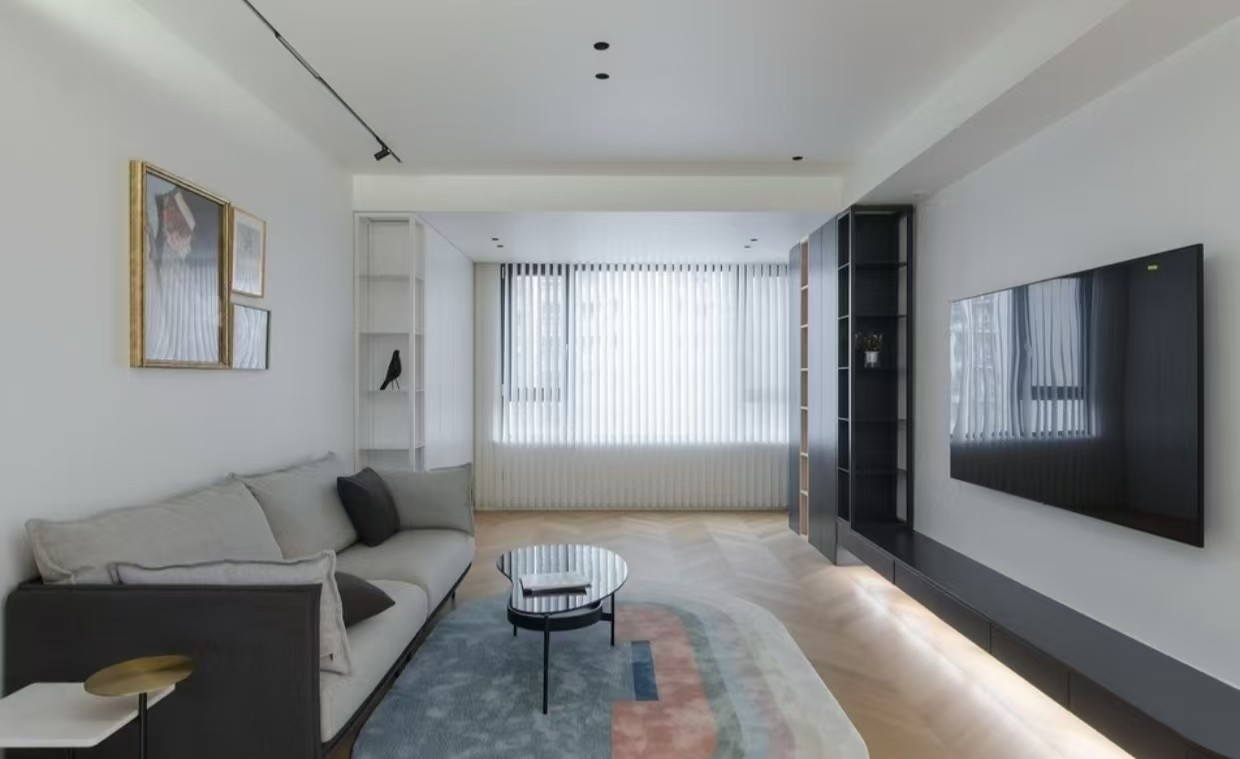 客厅整体色调以白色和灰色为主,营造出简洁、明亮的氛围。客厅内摆放着舒适的沙发,搭配小巧的茶几,显得时尚而实用。大面积的窗户让室内采光良好,电视背景墙设计简洁,增添了空间的整洁感