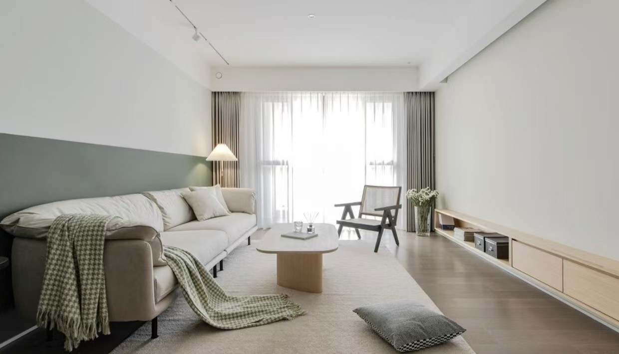 整体色调以浅色系为主,搭配深绿色的墙面装饰,形成视觉对比。家具选择简洁,沙发搭配几何图案的毯子,窗边设有休闲椅和茶几,自然光线充足,营造出舒适的氛围
